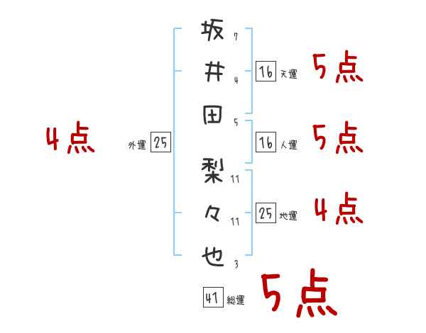 人運![]() | 坂井田梨々也さんの人運は16画の5つ星!人望が厚く大きく発展する。逆転成功が見える。 性格や才能などを表す2番目に重要な運勢です。人間関係や協調性、社会的な成功に影響します。主に20歳から50歳ぐらいまでの中年期の運勢を表します。 |