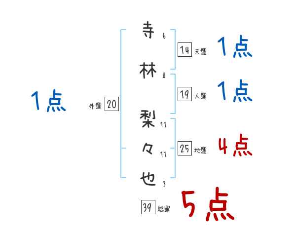 総運![]() | 寺林梨々也さんの総運は39画の5つ星!社交性に優れ人望が厚い。人の上に立ち成功する。 あなたの人生を表す1番重要な運勢です。生涯を通じて影響する総合運となり、主に50歳以降の晩年期に影響を及ぼします。 |