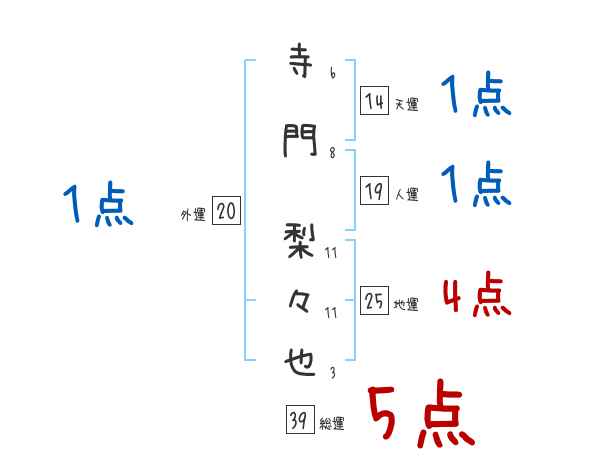 天運![]() | 寺門梨々也さんの天運は14画の1つ星!人に対して優しいがストレスを溜め込みがち。人間関係のトラブルを避けるよう気をつけましょう。 家系が持つ宿命的な運勢を表します。祖先から受け継いだ苗字ですので自分の力が及びません。家柄を象徴します。 |