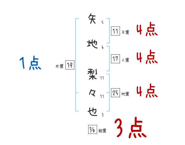 総運![]() | 矢地梨々也さんの総運は36画の3つ星!先見性が豊かです。多少神経質で苦労することも。 あなたの人生を表す1番重要な運勢です。生涯を通じて影響する総合運となり、主に50歳以降の晩年期に影響を及ぼします。 |