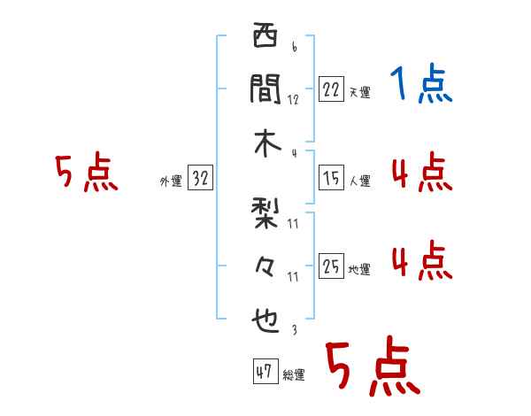 総運![]() | 西間木梨々也さんの総運は47画の5つ星!実力が開花し発展する円満な人生。財に恵まれる。 あなたの人生を表す1番重要な運勢です。生涯を通じて影響する総合運となり、主に50歳以降の晩年期に影響を及ぼします。 |