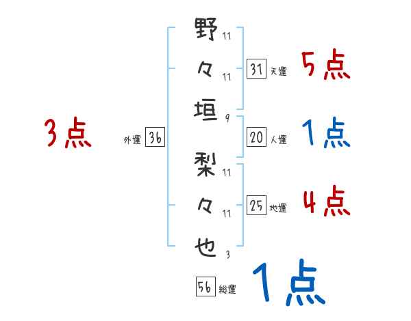 総運![]() | 野々垣梨々也さんの総運は56画の1つ星!消極的で無気力になりがち。誠実な気持ちが必要でしょう。 あなたの人生を表す1番重要な運勢です。生涯を通じて影響する総合運となり、主に50歳以降の晩年期に影響を及ぼします。 |