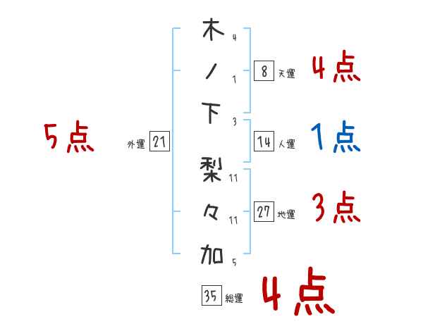 天運![]() | 木ノ下梨々加さんの天運は8画の4つ星!勤勉家。根気強く努力し成功する。忍耐力がある。 家系が持つ宿命的な運勢を表します。祖先から受け継いだ苗字ですので自分の力が及びません。家柄を象徴します。 |