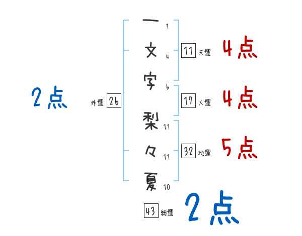 天運![]() | 一文字梨々夏さんの天運は11画の4つ星!着実に富や地位を得る幸運な人生。 家系が持つ宿命的な運勢を表します。祖先から受け継いだ苗字ですので自分の力が及びません。家柄を象徴します。 |