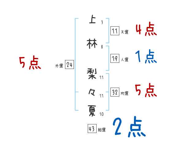 総運![]() | 上林梨々夏さんの総運は43画の2つ星!頑固な性格で独立心が強いかも。やや非現実的で浪費に注意しましょう。 あなたの人生を表す1番重要な運勢です。生涯を通じて影響する総合運となり、主に50歳以降の晩年期に影響を及ぼします。 |