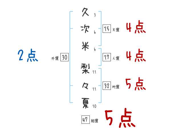 総運![]() | 久次米梨々夏さんの総運は47画の5つ星!実力が開花し発展する円満な人生。財に恵まれる。 あなたの人生を表す1番重要な運勢です。生涯を通じて影響する総合運となり、主に50歳以降の晩年期に影響を及ぼします。 |