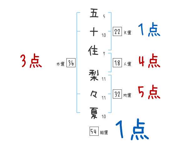 外運![]() | 五十住梨々夏さんの外運は36画の3つ星!先見性が豊かです。多少神経質で苦労することも。 生活面を象徴する運勢です。外部から受ける影響力を表し、結婚運、家庭運や職場、環境への順応性を表します。 |