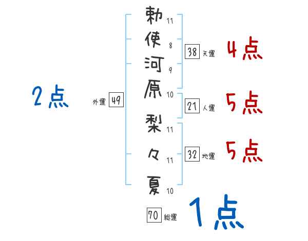 人運![]() | 勅使河原梨々夏さんの人運は21画の5つ星!統率力がある。独立し成功する。名誉を手に入れる。 性格や才能などを表す2番目に重要な運勢です。人間関係や協調性、社会的な成功に影響します。主に20歳から50歳ぐらいまでの中年期の運勢を表します。 |