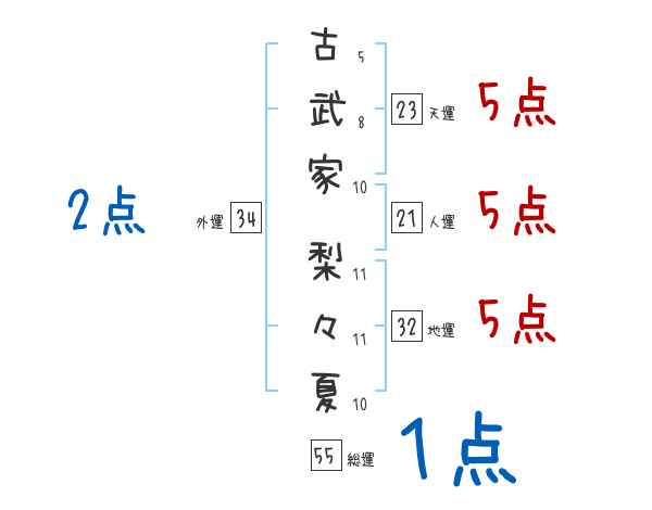 天運![]() | 古武家梨々夏さんの天運は23画の5つ星!想像力に優れ活力がある。一代で成功し名誉を手に入れる。 家系が持つ宿命的な運勢を表します。祖先から受け継いだ苗字ですので自分の力が及びません。家柄を象徴します。 |