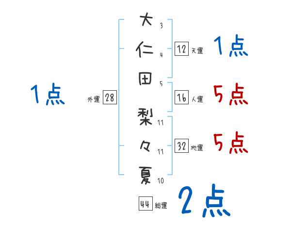 人運![]() | 大仁田梨々夏さんの人運は16画の5つ星!人望が厚く大きく発展する。逆転成功が見える。 性格や才能などを表す2番目に重要な運勢です。人間関係や協調性、社会的な成功に影響します。主に20歳から50歳ぐらいまでの中年期の運勢を表します。 |