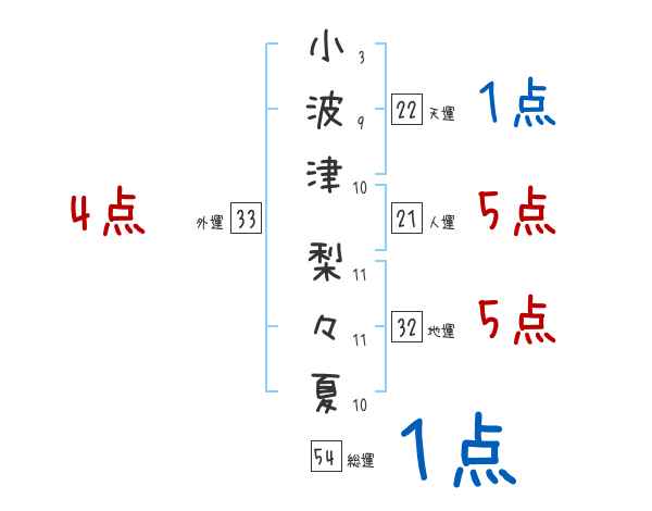 総運![]() | 小波津梨々夏さんの総運は54画の1つ星!トラブルが多いかも。周りをよく見て協調して過ごしましょう。 あなたの人生を表す1番重要な運勢です。生涯を通じて影響する総合運となり、主に50歳以降の晩年期に影響を及ぼします。 |