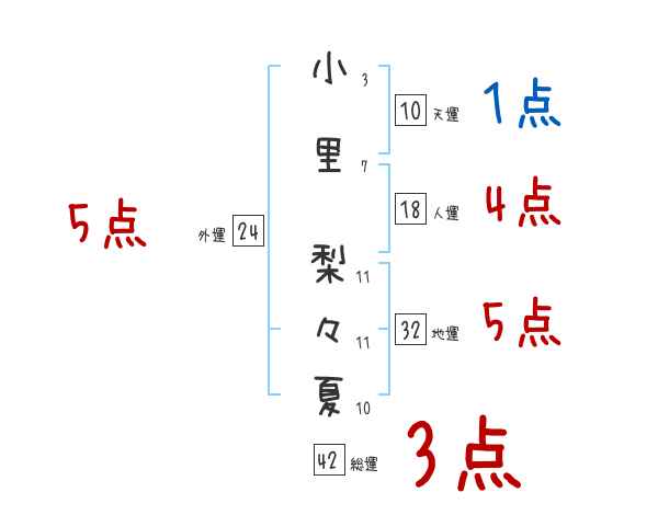 総運![]() | 小里梨々夏さんの総運は42画の3つ星!病気に注意。多芸であるが消極的でおとなしい。 あなたの人生を表す1番重要な運勢です。生涯を通じて影響する総合運となり、主に50歳以降の晩年期に影響を及ぼします。 |