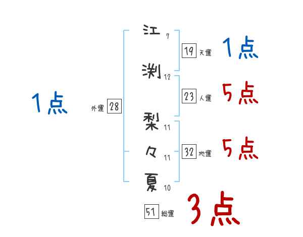 総運![]() | 江渕梨々夏さんの総運は51画の3つ星!変化が激しく、危険に注意。堅実な性格。 あなたの人生を表す1番重要な運勢です。生涯を通じて影響する総合運となり、主に50歳以降の晩年期に影響を及ぼします。 |