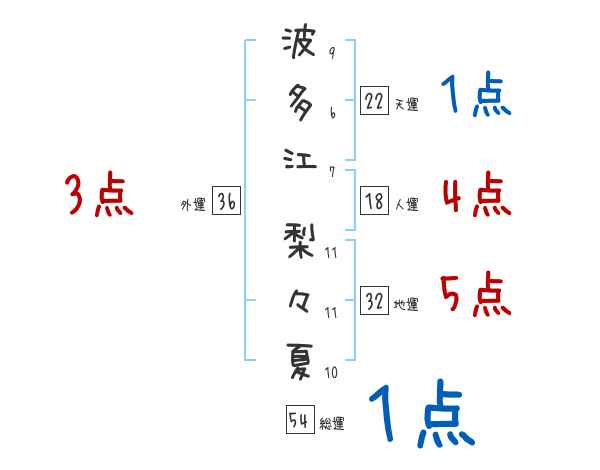 外運![]() | 波多江梨々夏さんの外運は36画の3つ星!先見性が豊かです。多少神経質で苦労することも。 生活面を象徴する運勢です。外部から受ける影響力を表し、結婚運、家庭運や職場、環境への順応性を表します。 |