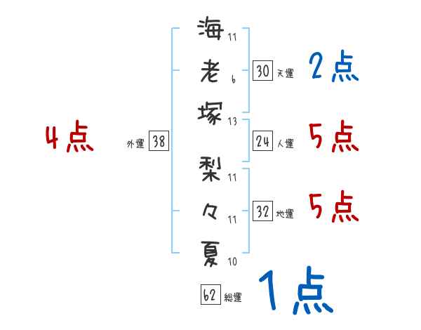 天運![]() | 海老塚梨々夏さんの天運は30画の2つ星!浮き沈みの激しさに注意しましょう。 家系が持つ宿命的な運勢を表します。祖先から受け継いだ苗字ですので自分の力が及びません。家柄を象徴します。 |