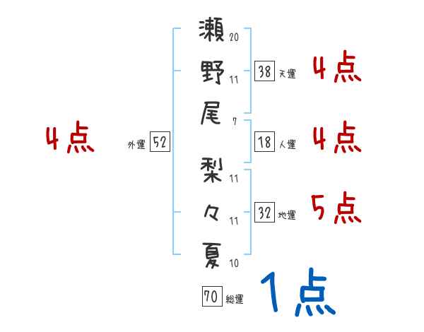 地運![]() | 瀬野尾梨々夏さんの地運は32画の5つ星!柔軟性があり成功する。チャンスが多く金運が良い。 個性を表す基礎的な運勢です。性格形成や対人関係、行動力など家庭環境に影響されます。主に誕生してから20歳くらいまでの若年期の運勢を表します。 |