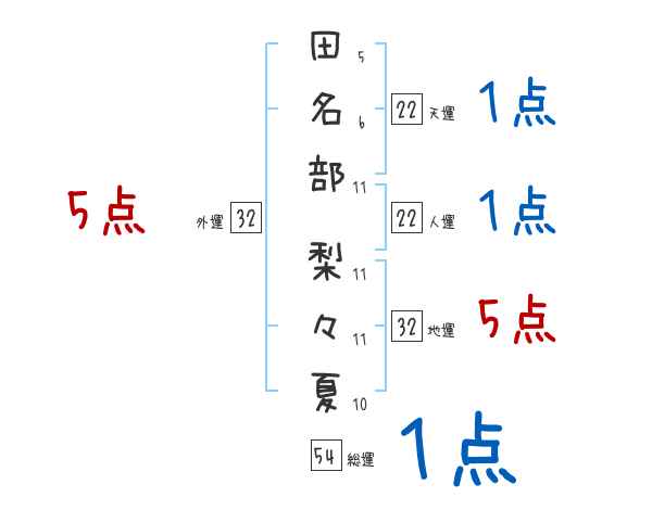 外運![]() | 田名部梨々夏さんの外運は32画の5つ星!柔軟性があり成功する。チャンスが多く金運が良い。 生活面を象徴する運勢です。外部から受ける影響力を表し、結婚運、家庭運や職場、環境への順応性を表します。 |