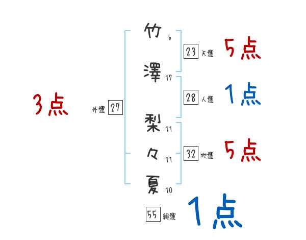 天運![]() | 竹澤梨々夏さんの天運は23画の5つ星!想像力に優れ活力がある。一代で成功し名誉を手に入れる。 家系が持つ宿命的な運勢を表します。祖先から受け継いだ苗字ですので自分の力が及びません。家柄を象徴します。 |