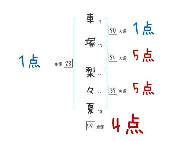 外運![]() | 車塚梨々夏さんの外運は28画の1つ星!家庭環境に注意。スポーツで活躍できる能力があるかも。 生活面を象徴する運勢です。外部から受ける影響力を表し、結婚運、家庭運や職場、環境への順応性を表します。 |