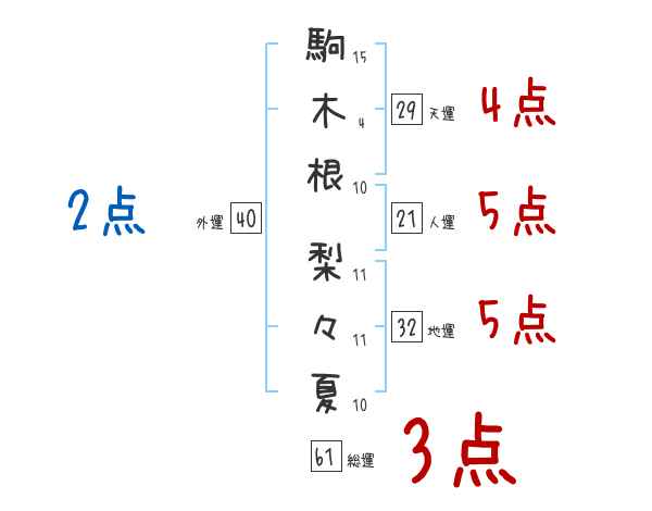 天運![]() | 駒木根梨々夏さんの天運は29画の4つ星!完全主義で才能がある。厳格な心の持ち主。 家系が持つ宿命的な運勢を表します。祖先から受け継いだ苗字ですので自分の力が及びません。家柄を象徴します。 |