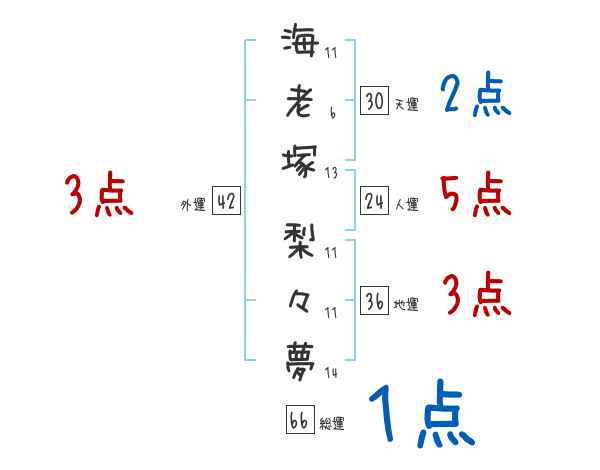 天運![]() | 海老塚梨々夢さんの天運は30画の2つ星!浮き沈みの激しさに注意しましょう。 家系が持つ宿命的な運勢を表します。祖先から受け継いだ苗字ですので自分の力が及びません。家柄を象徴します。 |