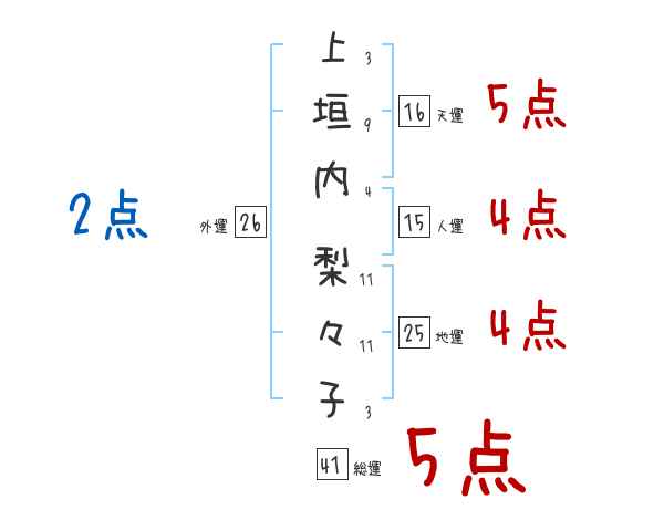 外運![]() | 上垣内梨々子さんの外運は26画の2つ星!波瀾万丈かも。信頼できる人を大事にしましょう。 生活面を象徴する運勢です。外部から受ける影響力を表し、結婚運、家庭運や職場、環境への順応性を表します。 |