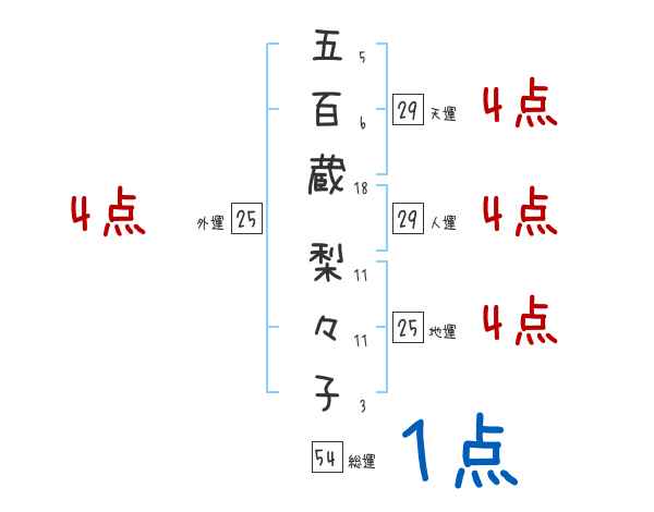 天運![]() | 五百蔵梨々子さんの天運は29画の4つ星!完全主義で才能がある。厳格な心の持ち主。 家系が持つ宿命的な運勢を表します。祖先から受け継いだ苗字ですので自分の力が及びません。家柄を象徴します。 |