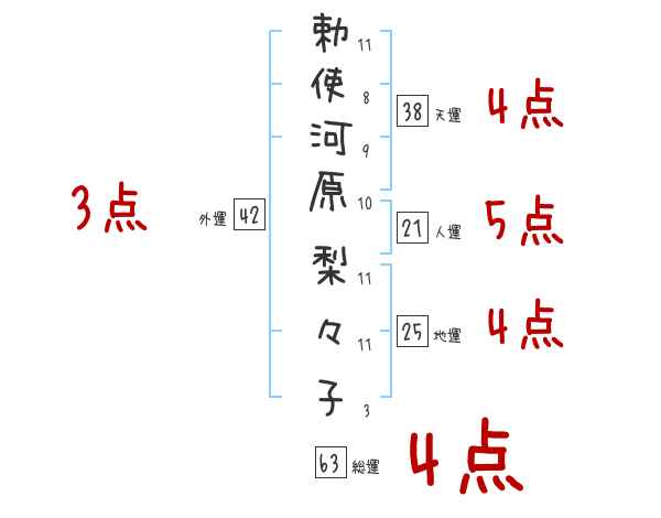 総運![]() | 勅使河原梨々子さんの総運は63画の4つ星!家庭運がよく順調な生活。温和な性格。 あなたの人生を表す1番重要な運勢です。生涯を通じて影響する総合運となり、主に50歳以降の晩年期に影響を及ぼします。 |