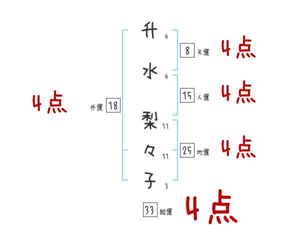 天運![]() | 升水梨々子さんの天運は8画の4つ星!勤勉家。根気強く努力し成功する。忍耐力がある。 家系が持つ宿命的な運勢を表します。祖先から受け継いだ苗字ですので自分の力が及びません。家柄を象徴します。 |