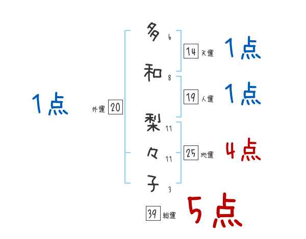 総運![]() | 多和梨々子さんの総運は39画の5つ星!社交性に優れ人望が厚い。人の上に立ち成功する。 あなたの人生を表す1番重要な運勢です。生涯を通じて影響する総合運となり、主に50歳以降の晩年期に影響を及ぼします。 |