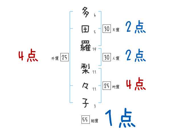 天運![]() | 多田羅梨々子さんの天運は30画の2つ星!浮き沈みの激しさに注意しましょう。 家系が持つ宿命的な運勢を表します。祖先から受け継いだ苗字ですので自分の力が及びません。家柄を象徴します。 |