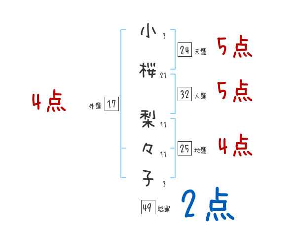 人運![]() | 小桜梨々子さんの人運は32画の5つ星!柔軟性があり成功する。チャンスが多く金運が良い。 性格や才能などを表す2番目に重要な運勢です。人間関係や協調性、社会的な成功に影響します。主に20歳から50歳ぐらいまでの中年期の運勢を表します。 |