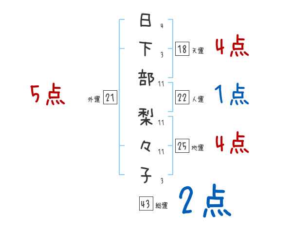 天運![]() | 日下部梨々子さんの天運は18画の4つ星!情熱的で剛気。忍耐力があり信頼される。 家系が持つ宿命的な運勢を表します。祖先から受け継いだ苗字ですので自分の力が及びません。家柄を象徴します。 |