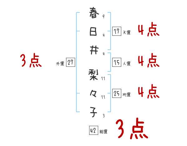総運![]() | 春日井梨々子さんの総運は42画の3つ星!病気に注意。多芸であるが消極的でおとなしい。 あなたの人生を表す1番重要な運勢です。生涯を通じて影響する総合運となり、主に50歳以降の晩年期に影響を及ぼします。 |