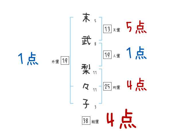 天運![]() | 末武梨々子さんの天運は13画の5つ星!才能に恵まれ人気がある。名声を手に入れる。円満な人生。 家系が持つ宿命的な運勢を表します。祖先から受け継いだ苗字ですので自分の力が及びません。家柄を象徴します。 |