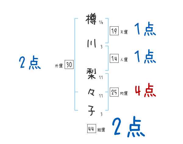 総運![]() | 樽川梨々子さんの総運は44画の2つ星!誠実で慎重な性格。物事を考えすぎないように注意しましょう。 あなたの人生を表す1番重要な運勢です。生涯を通じて影響する総合運となり、主に50歳以降の晩年期に影響を及ぼします。 |