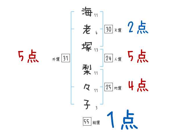 天運![]() | 海老塚梨々子さんの天運は30画の2つ星!浮き沈みの激しさに注意しましょう。 家系が持つ宿命的な運勢を表します。祖先から受け継いだ苗字ですので自分の力が及びません。家柄を象徴します。 |