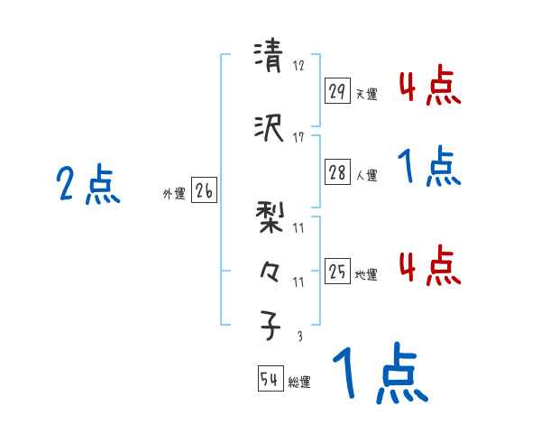 外運![]() | 清沢梨々子さんの外運は26画の2つ星!波瀾万丈かも。信頼できる人を大事にしましょう。 生活面を象徴する運勢です。外部から受ける影響力を表し、結婚運、家庭運や職場、環境への順応性を表します。 |