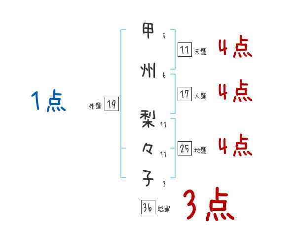 総運![]() | 甲州梨々子さんの総運は36画の3つ星!先見性が豊かです。多少神経質で苦労することも。 あなたの人生を表す1番重要な運勢です。生涯を通じて影響する総合運となり、主に50歳以降の晩年期に影響を及ぼします。 |