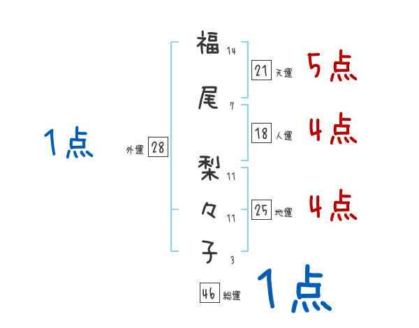 総運![]() | 福尾梨々子さんの総運は46画の1つ星!迷走することが多く苦労するかも。目先のことにとらわれないように。 あなたの人生を表す1番重要な運勢です。生涯を通じて影響する総合運となり、主に50歳以降の晩年期に影響を及ぼします。 |