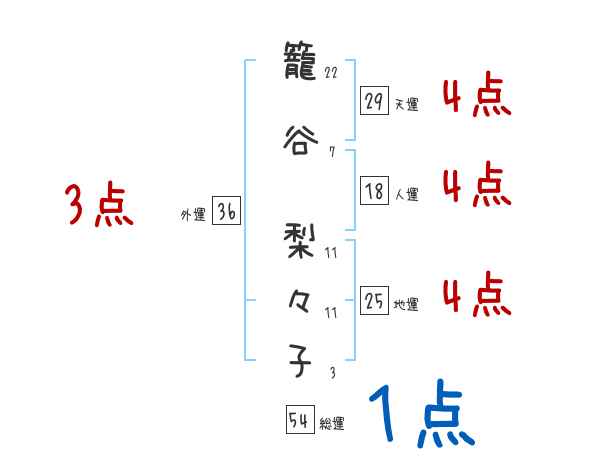 外運![]() | 籠谷梨々子さんの外運は36画の3つ星!先見性が豊かです。多少神経質で苦労することも。 生活面を象徴する運勢です。外部から受ける影響力を表し、結婚運、家庭運や職場、環境への順応性を表します。 |