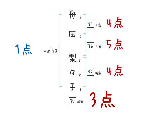 総運![]() | 舟田梨々子さんの総運は36画の3つ星!先見性が豊かです。多少神経質で苦労することも。 あなたの人生を表す1番重要な運勢です。生涯を通じて影響する総合運となり、主に50歳以降の晩年期に影響を及ぼします。 |