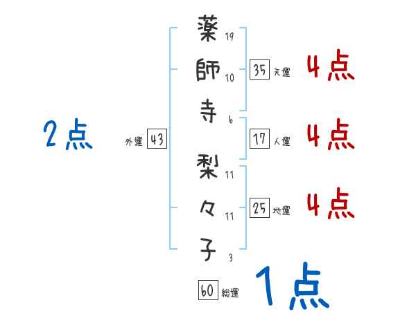 | 総運  | 薬師寺梨々子さんの総運は60画の1つ星!悲観的で迷いやすい。波乱が多く損をしないように。あなたの人生を表す1番重要な運勢です。生涯を通じて影響する総合運となり、主に50歳以降の晩年期に影響を及ぼします。 |