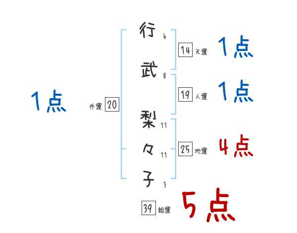 総運![]() | 行武梨々子さんの総運は39画の5つ星!社交性に優れ人望が厚い。人の上に立ち成功する。 あなたの人生を表す1番重要な運勢です。生涯を通じて影響する総合運となり、主に50歳以降の晩年期に影響を及ぼします。 |