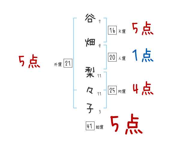 外運![]() | 谷畑梨々子さんの外運は21画の5つ星!統率力がある。独立し成功する。名誉を手に入れる。 生活面を象徴する運勢です。外部から受ける影響力を表し、結婚運、家庭運や職場、環境への順応性を表します。 |