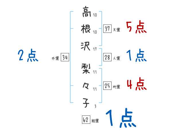 総運![]() | 高根沢梨々子さんの総運は62画の1つ星!困難なトラブルが多く精神的に疲労しないように気をつけましょう。 あなたの人生を表す1番重要な運勢です。生涯を通じて影響する総合運となり、主に50歳以降の晩年期に影響を及ぼします。 |