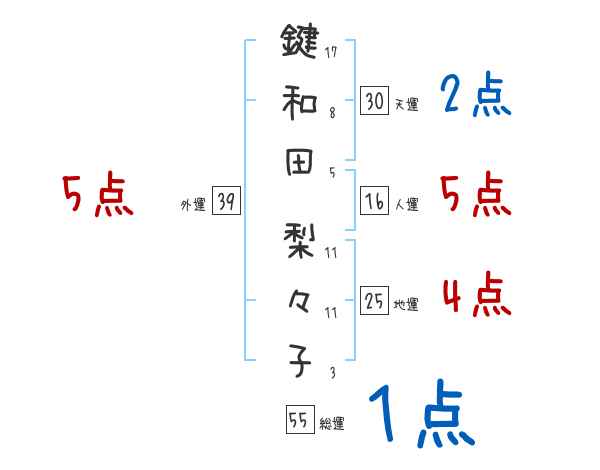 人運![]() | 鍵和田梨々子さんの人運は16画の5つ星!人望が厚く大きく発展する。逆転成功が見える。 性格や才能などを表す2番目に重要な運勢です。人間関係や協調性、社会的な成功に影響します。主に20歳から50歳ぐらいまでの中年期の運勢を表します。 |