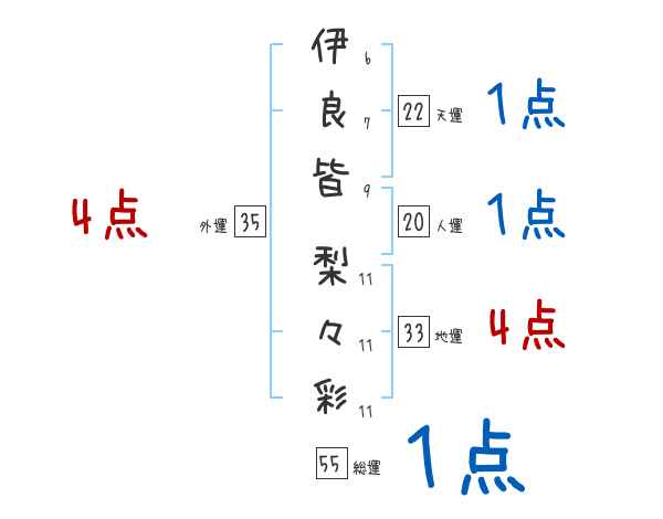 外運![]() | 伊良皆梨々彩さんの外運は35画の4つ星!温厚な性格で感受性が高い。穏和な性格で人望が厚い。 生活面を象徴する運勢です。外部から受ける影響力を表し、結婚運、家庭運や職場、環境への順応性を表します。 |