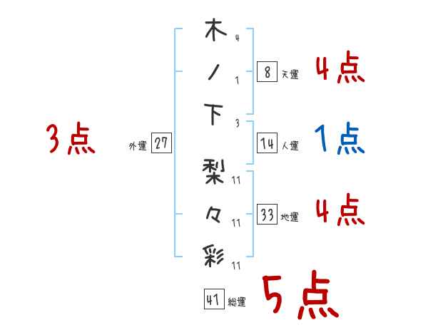 天運![]() | 木ノ下梨々彩さんの天運は8画の4つ星!勤勉家。根気強く努力し成功する。忍耐力がある。 家系が持つ宿命的な運勢を表します。祖先から受け継いだ苗字ですので自分の力が及びません。家柄を象徴します。 |