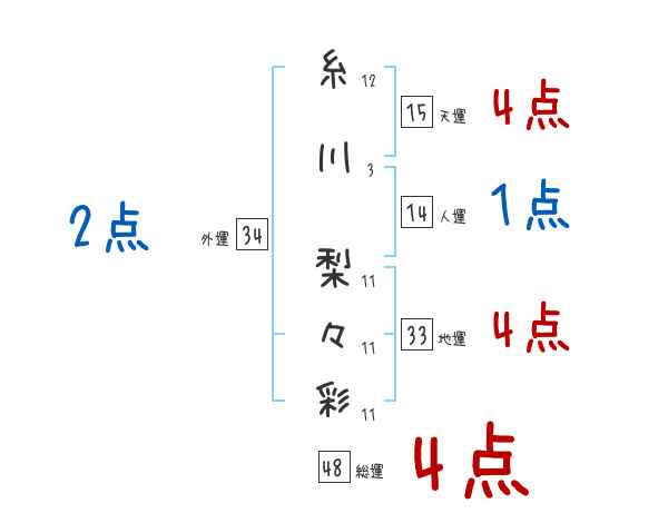 外運![]() | 糸川梨々彩さんの外運は34画の2つ星!独創性に優れるが、自尊心が強く災難に注意しましょう。 生活面を象徴する運勢です。外部から受ける影響力を表し、結婚運、家庭運や職場、環境への順応性を表します。 |